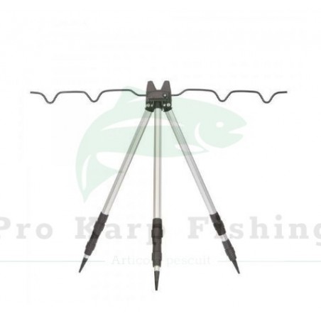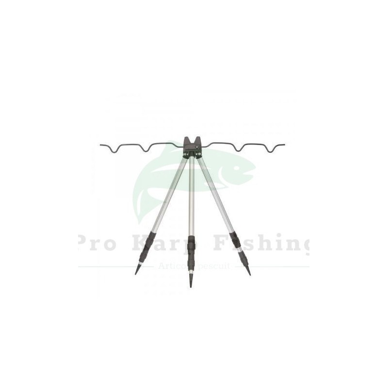 Tripod telescopic din aluminiu, special proiectat pentru pescarii de stationar. Trepiedul dispune de 3 picioare telescopice reglabile in 2 sectiuni, si are o inaltime maxima de 123cm. In centrul standului este pozitionat un carlig robust pentru suspensie ce poate fi echipat cu o greutate in plus, sporind stabilitatea atunci cand este necesar. Dispune de un suport din aluminiu, ce permite pozitionarea individuala a lansetelor in functie de preferintele pescarului. Greutatea redusa si dimensiunile reduse dupa ce este pliat, fac acest tripod usor de transportat si de depozitat.